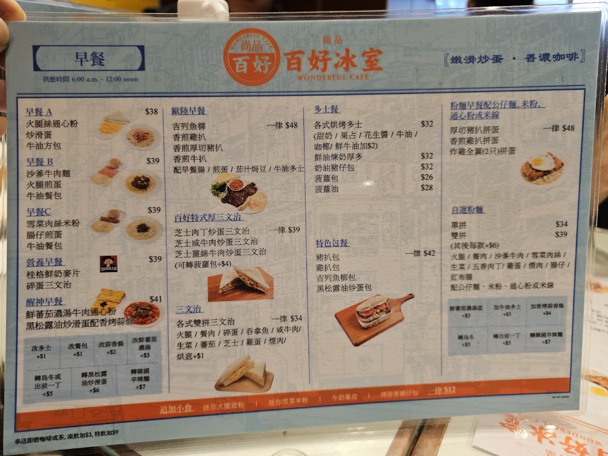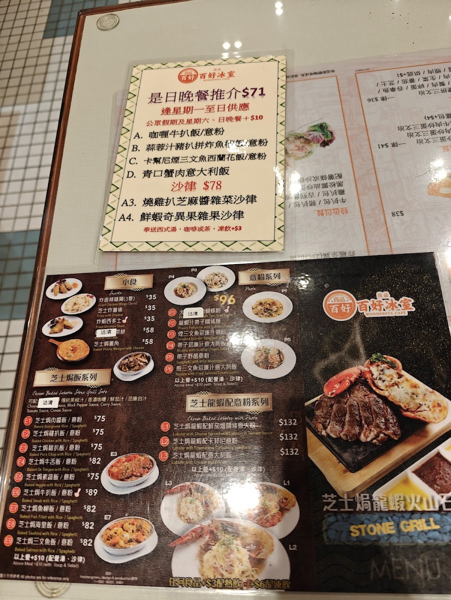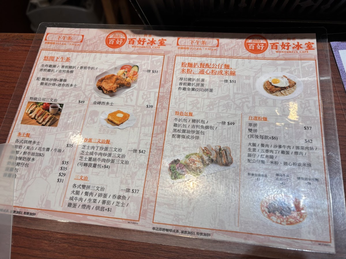 From a reviewer’s perspective, the menu at Wonderful Cafe, located at 160 Shau Kei Wan Rd, offers a satisfying and well-rounded snapshot of classic Hong Kong café dining, bringing together comfort, variety, and all-day convenience. The strength of the menu lies in its breadth: whether it is the hearty All Day Breakfast featuring Chicken Fillet, Sausage, Bacon, Tomato, Baked Beans And Fries, or the more indulgent Grilled Steak set, the café clearly caters to diners looking for filling, familiar flavors from morning through evening. The structured Breakfast options such as Set A - Macaroni With Sliced Ham, Wake You Up Breakfast, and Set B - Satay Beef With Instant Noodles reflect traditional local tastes, while the Continental Breakfast provides a lighter Western-style alternative. For lunch and dinner, the menu expands into more substantial offerings, including Special Sets like Chicken Fillet With Korean Spicy Noodles, Spaghetti In Soup With BBQ Pork, Pork Chop With Korean Spicy Noodles, and Beef Short Ribs With Macaroni In Tomato Soup, which balance comfort with bold seasoning. Cheese lovers will appreciate the Baked Rice With Cheese series, especially Baked Chicken With Cheese Rice, Baked Bolognese Rice, Baked Pork Chop With Rice, Baked Ox Tongue With Rice, and Baked Veggie With Rice, all of which feel rich and satisfying. Rice-based staples continue with Specialty Rice dishes such as Fried Chicken Thigh With Fried Egg And Spring Onion, Pork Chop With Fried Egg And Spring Onion, Chicken Fillet With Fried Egg And Spring Onion, and Fish Cutlet With Fried Egg And Spring Onion, alongside comforting classics from the Homemade Minced Pork Rice selection like Sliced Beef And Onion With Minced Pork Rice, Chicken Fillet With Minced Pork Rice, and Luncheon Meat And Salty Egg With Minced Pork Rice. The menu also shines during off-peak hours, with Leisure Afternoon Tea options such as Fish Fillet Cutlet With Mixed Fruit Salad And French Fries, Deep-Fried Chicken Thigh With Mixed Fruit Salad And Fries, French Toast, and the Premium Club Sandwich, complemented by indulgent Wonderful Grilled Cheese Thick Sandwiches like Beef With Fried Egg And Cheese Sandwich, Corned Beef With Fried Egg And Cheese Sandwich, and Spiced Pork Bites With Fried Egg And Cheese Sandwich. Evening diners are well served by Stone Grill Sets including Chicken Thigh Steak, Pork Chop, and Sirloin Steak, as well as Wonderful Curry dishes such as Beef Short Ribs In Wonderful Curry, Beef In Wonderful Curry, and Fish Fillet In Wonderful Curry. Finally, simple pleasures like Pork Chop Bun, Fish Cutlet Bun, Grilled Chicken Bun, Fries With Cheese, Fried Shrimps Toast, and classic beverages including Citrus Honey (Hot), Ribena With Lemon (Iced), Chocolate (Hot/Iced), and Coffee (Iced) neatly round out the experience, making Wonderful Cafe’s menu a dependable, all-day companion for casual dining in Shau Kei Wan.