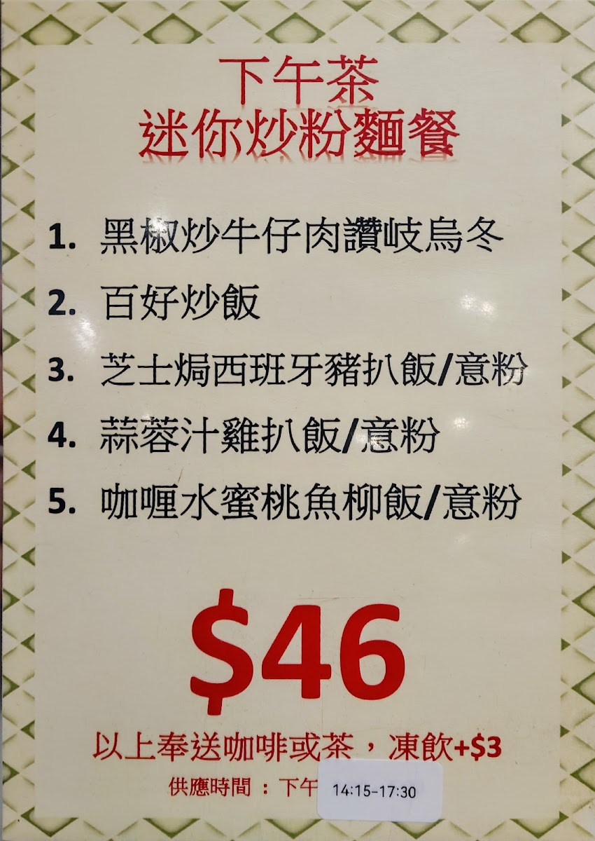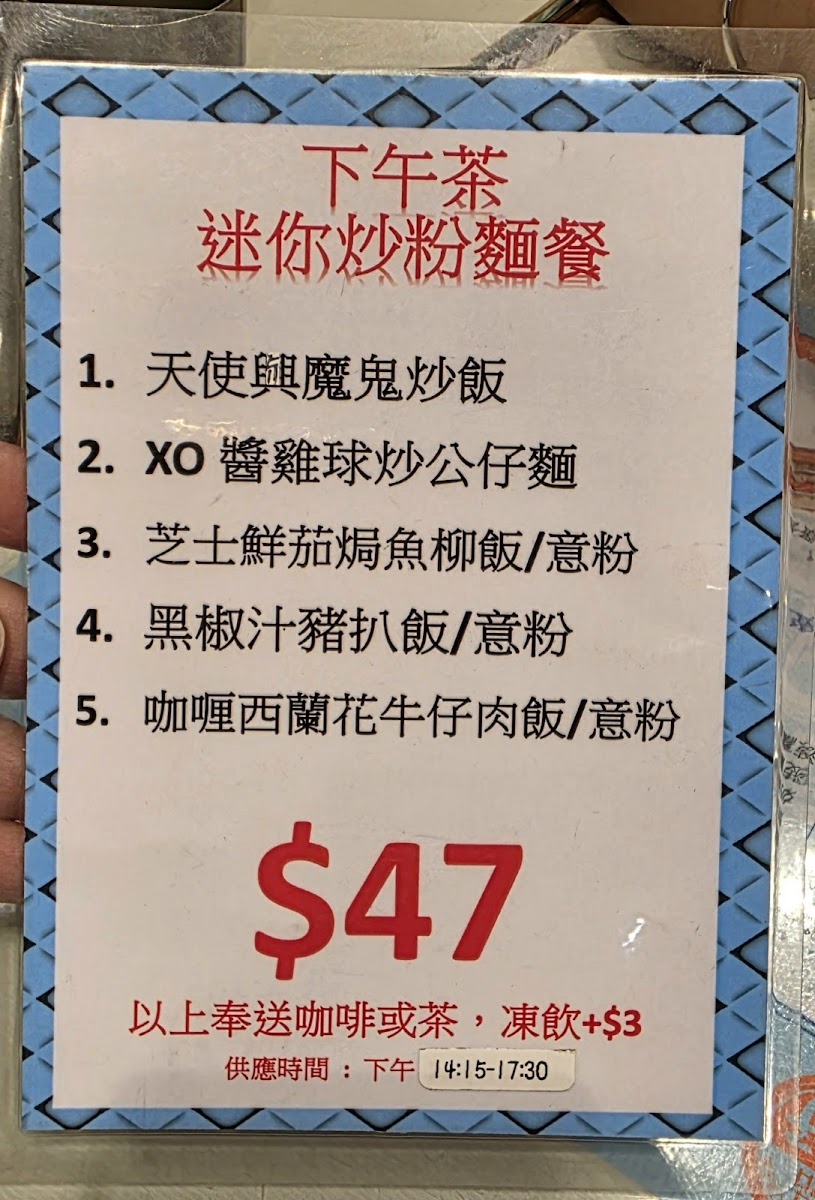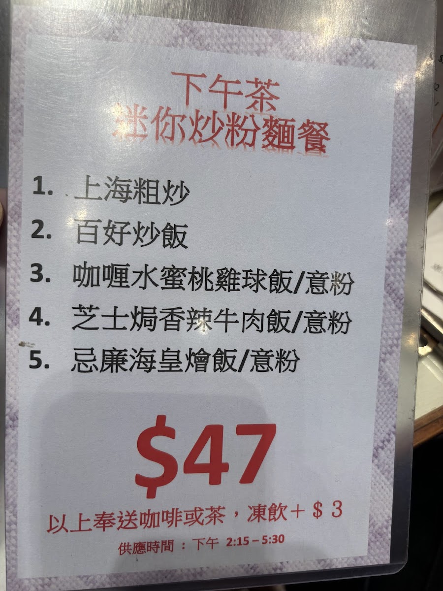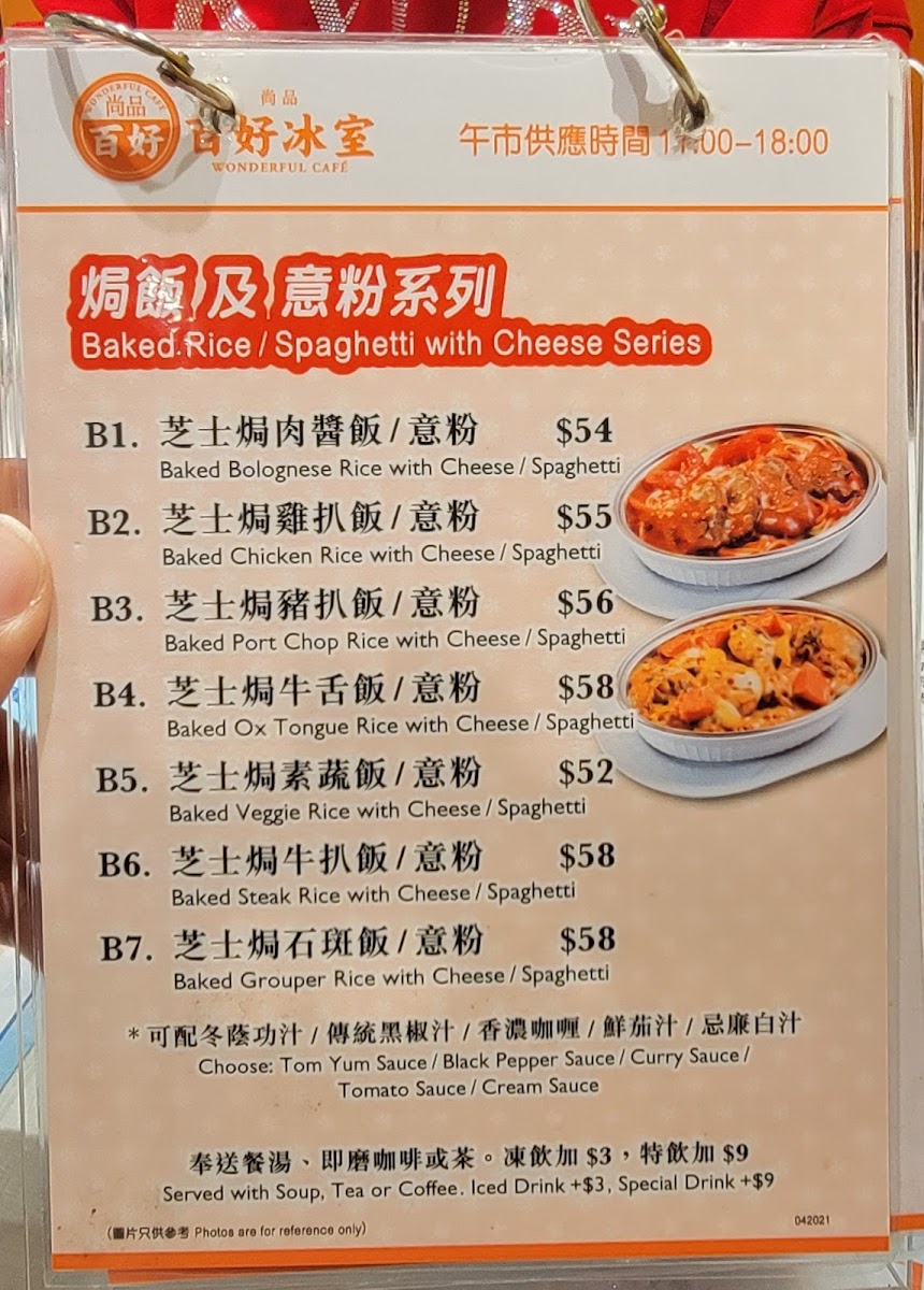 From a reviewer’s perspective, the menu at Wonderful Cafe, located at 160 Shau Kei Wan Rd, offers a satisfying and well-rounded snapshot of classic Hong Kong café dining, bringing together comfort, variety, and all-day convenience. The strength of the menu lies in its breadth: whether it is the hearty All Day Breakfast featuring Chicken Fillet, Sausage, Bacon, Tomato, Baked Beans And Fries, or the more indulgent Grilled Steak set, the café clearly caters to diners looking for filling, familiar flavors from morning through evening. The structured Breakfast options such as Set A - Macaroni With Sliced Ham, Wake You Up Breakfast, and Set B - Satay Beef With Instant Noodles reflect traditional local tastes, while the Continental Breakfast provides a lighter Western-style alternative. For lunch and dinner, the menu expands into more substantial offerings, including Special Sets like Chicken Fillet With Korean Spicy Noodles, Spaghetti In Soup With BBQ Pork, Pork Chop With Korean Spicy Noodles, and Beef Short Ribs With Macaroni In Tomato Soup, which balance comfort with bold seasoning. Cheese lovers will appreciate the Baked Rice With Cheese series, especially Baked Chicken With Cheese Rice, Baked Bolognese Rice, Baked Pork Chop With Rice, Baked Ox Tongue With Rice, and Baked Veggie With Rice, all of which feel rich and satisfying. Rice-based staples continue with Specialty Rice dishes such as Fried Chicken Thigh With Fried Egg And Spring Onion, Pork Chop With Fried Egg And Spring Onion, Chicken Fillet With Fried Egg And Spring Onion, and Fish Cutlet With Fried Egg And Spring Onion, alongside comforting classics from the Homemade Minced Pork Rice selection like Sliced Beef And Onion With Minced Pork Rice, Chicken Fillet With Minced Pork Rice, and Luncheon Meat And Salty Egg With Minced Pork Rice. The menu also shines during off-peak hours, with Leisure Afternoon Tea options such as Fish Fillet Cutlet With Mixed Fruit Salad And French Fries, Deep-Fried Chicken Thigh With Mixed Fruit Salad And Fries, French Toast, and the Premium Club Sandwich, complemented by indulgent Wonderful Grilled Cheese Thick Sandwiches like Beef With Fried Egg And Cheese Sandwich, Corned Beef With Fried Egg And Cheese Sandwich, and Spiced Pork Bites With Fried Egg And Cheese Sandwich. Evening diners are well served by Stone Grill Sets including Chicken Thigh Steak, Pork Chop, and Sirloin Steak, as well as Wonderful Curry dishes such as Beef Short Ribs In Wonderful Curry, Beef In Wonderful Curry, and Fish Fillet In Wonderful Curry. Finally, simple pleasures like Pork Chop Bun, Fish Cutlet Bun, Grilled Chicken Bun, Fries With Cheese, Fried Shrimps Toast, and classic beverages including Citrus Honey (Hot), Ribena With Lemon (Iced), Chocolate (Hot/Iced), and Coffee (Iced) neatly round out the experience, making Wonderful Cafe’s menu a dependable, all-day companion for casual dining in Shau Kei Wan.